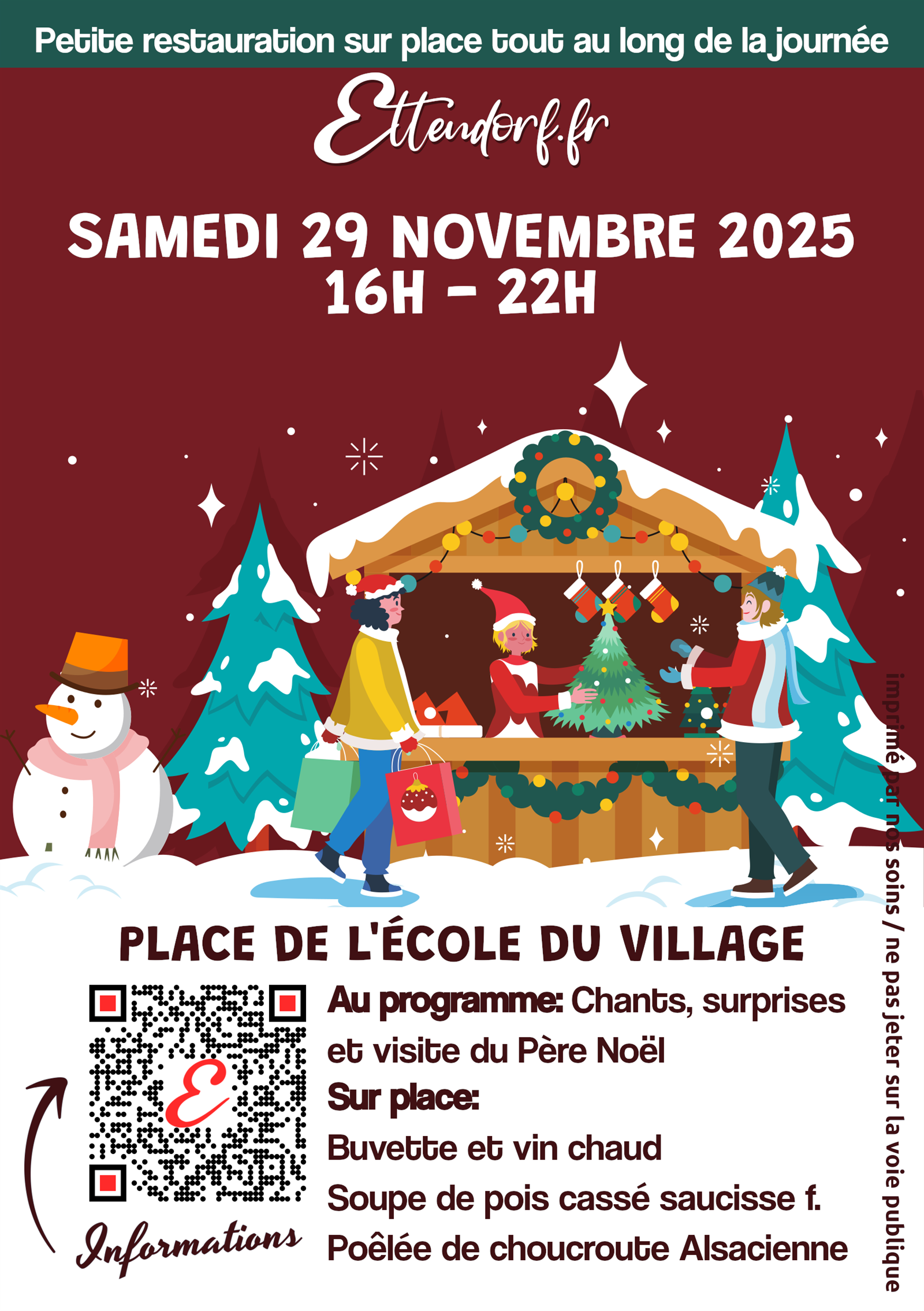 Le premier marché de Noël du village s'installe à Ettendorf, sur la place de l'école du village ! Au programme : chants, surprises et visite du Père Noël... Et sur place : restauration avec soupe de pois cassé, poêlée de choucroute alsacienne et buvette, vin chaud. Une quinzaine d'exposants sont présents pour cette belle journée.