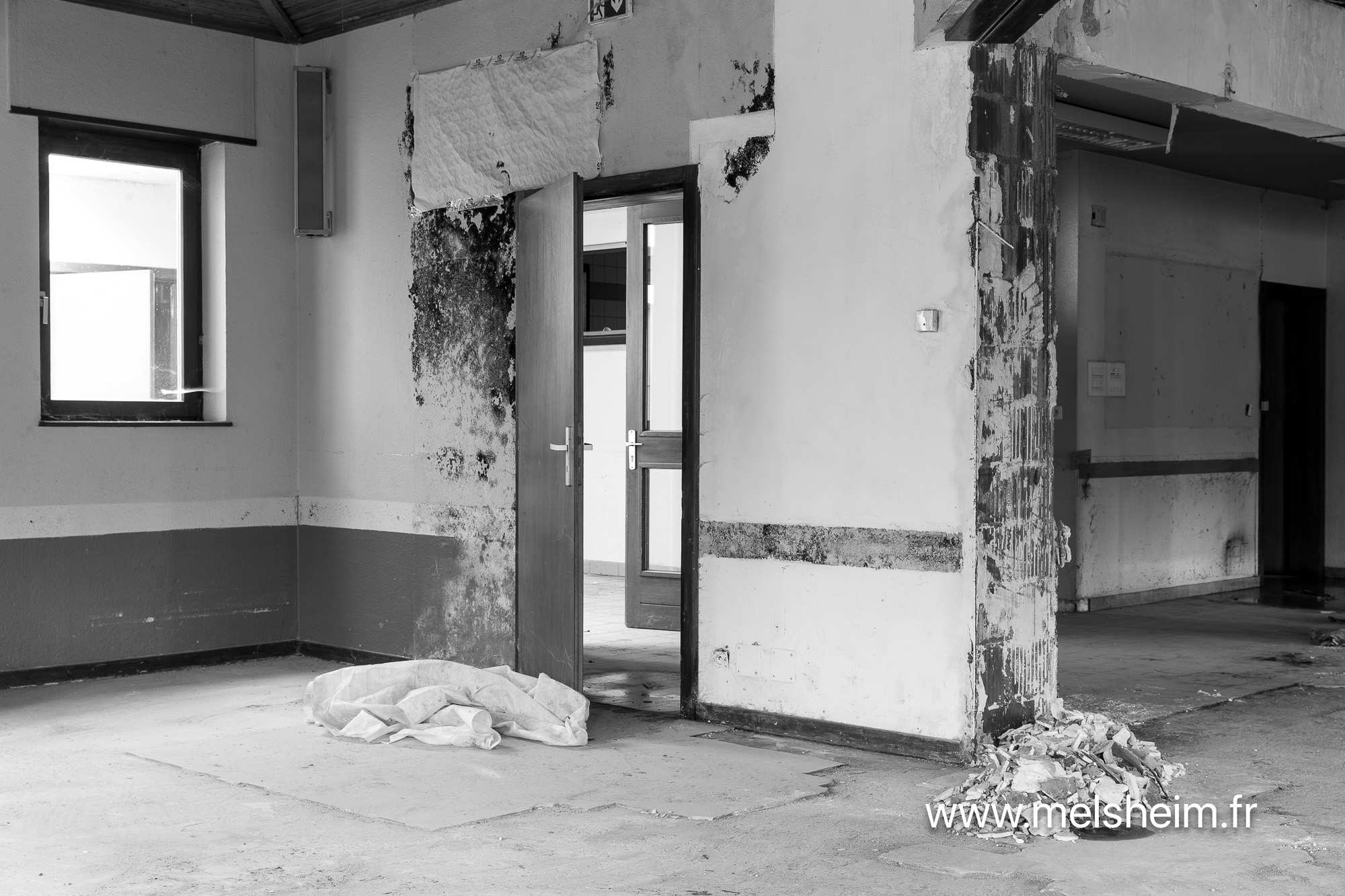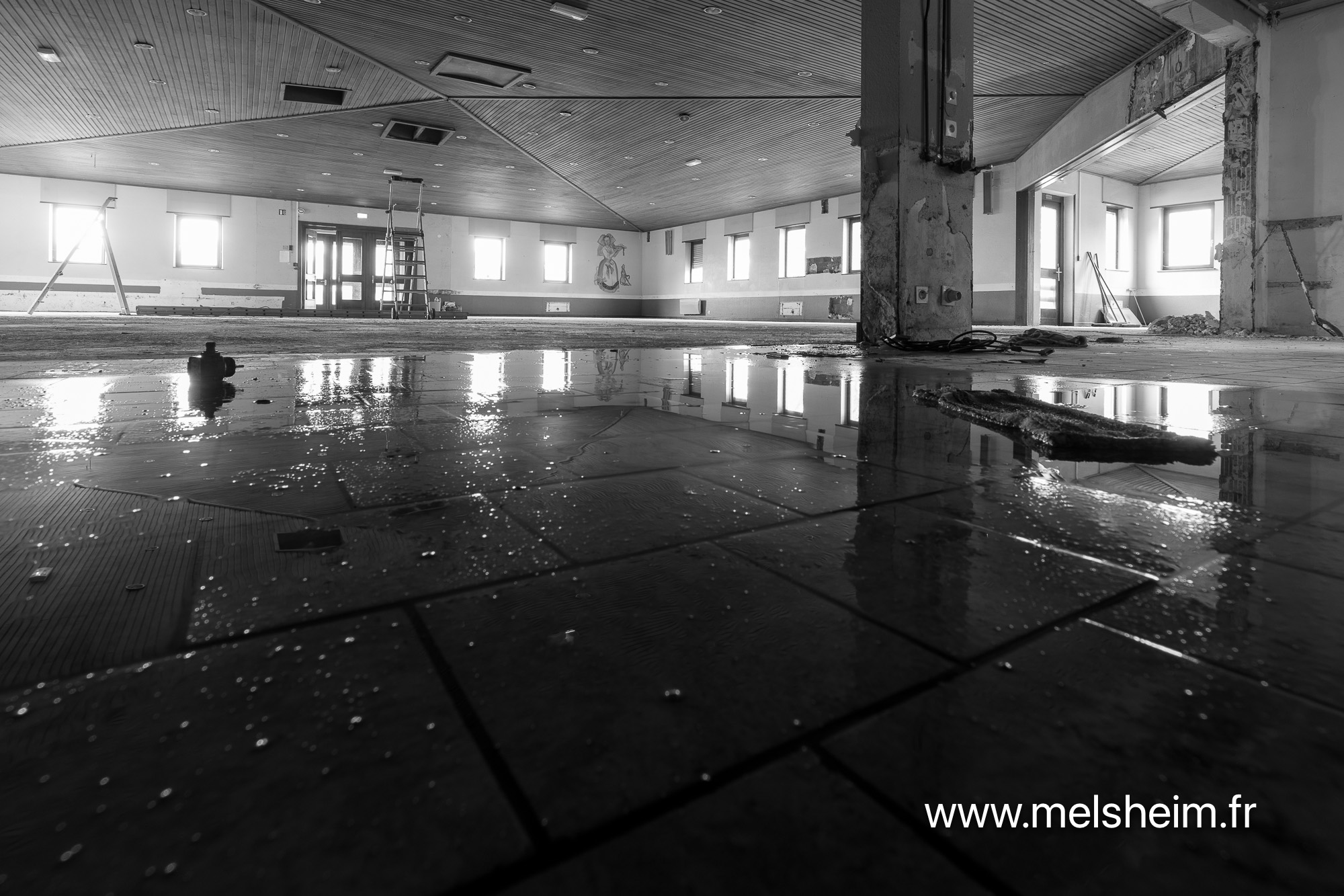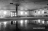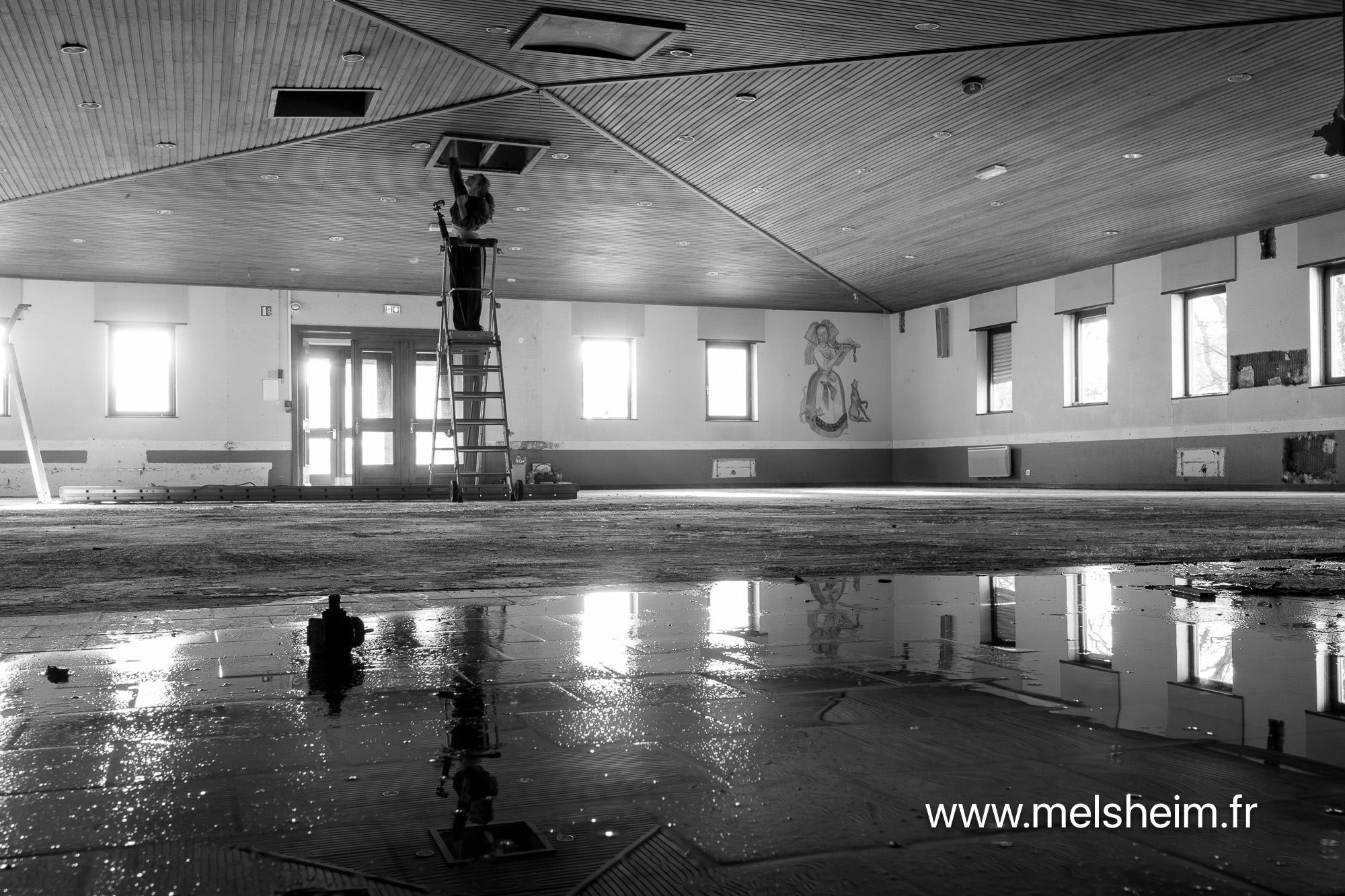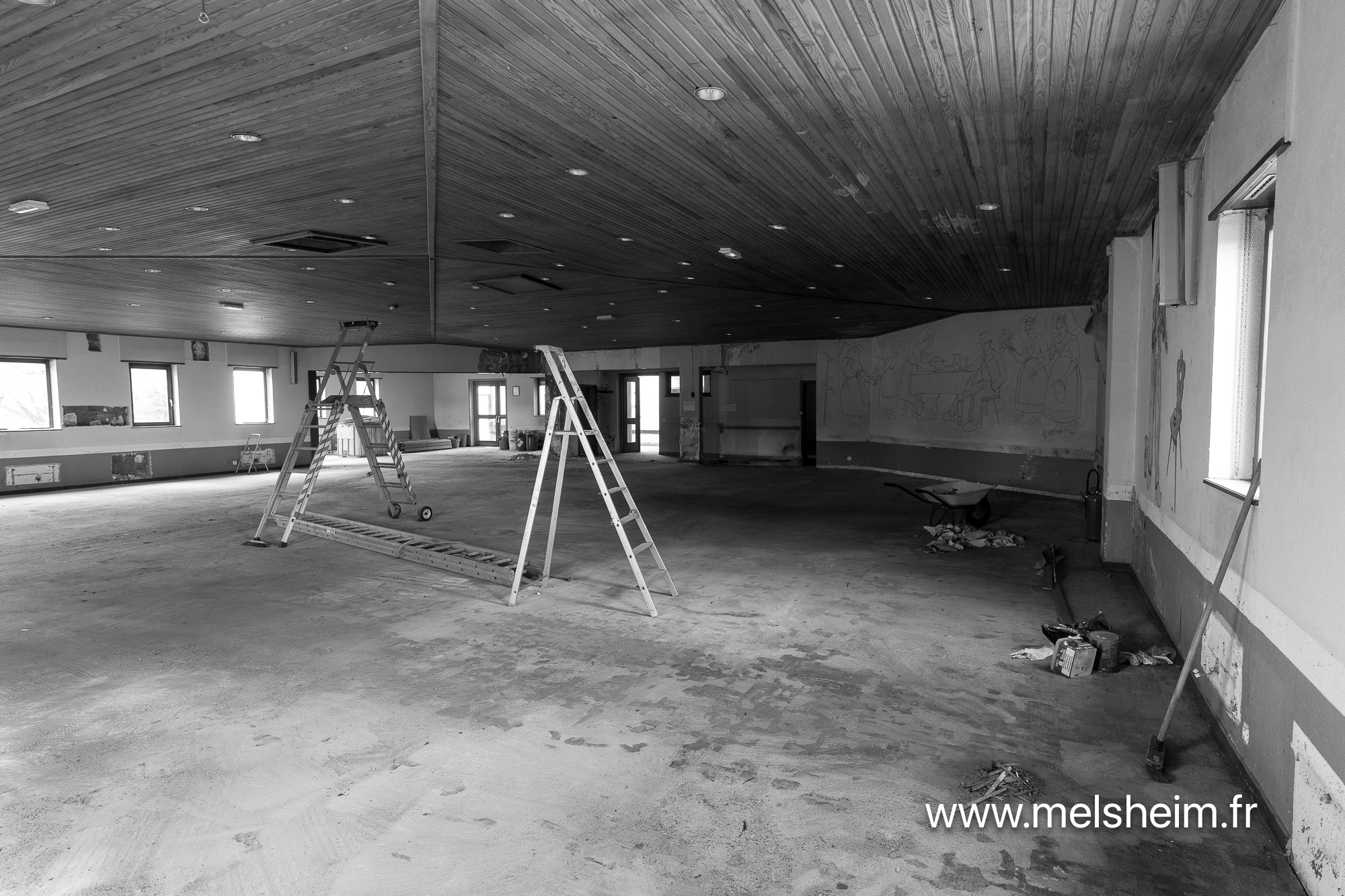 Depuis plusieurs années la salle des fêtes souffre de son âge. La principale cause de dégradations vient de fuites récurrentes dans la toiture. Ces fuites ont été colmatées quand c'était possible, mais ont provoqué des dégâts des eaux dans le parquet de la salle et aussi des infiltration dans les murs.